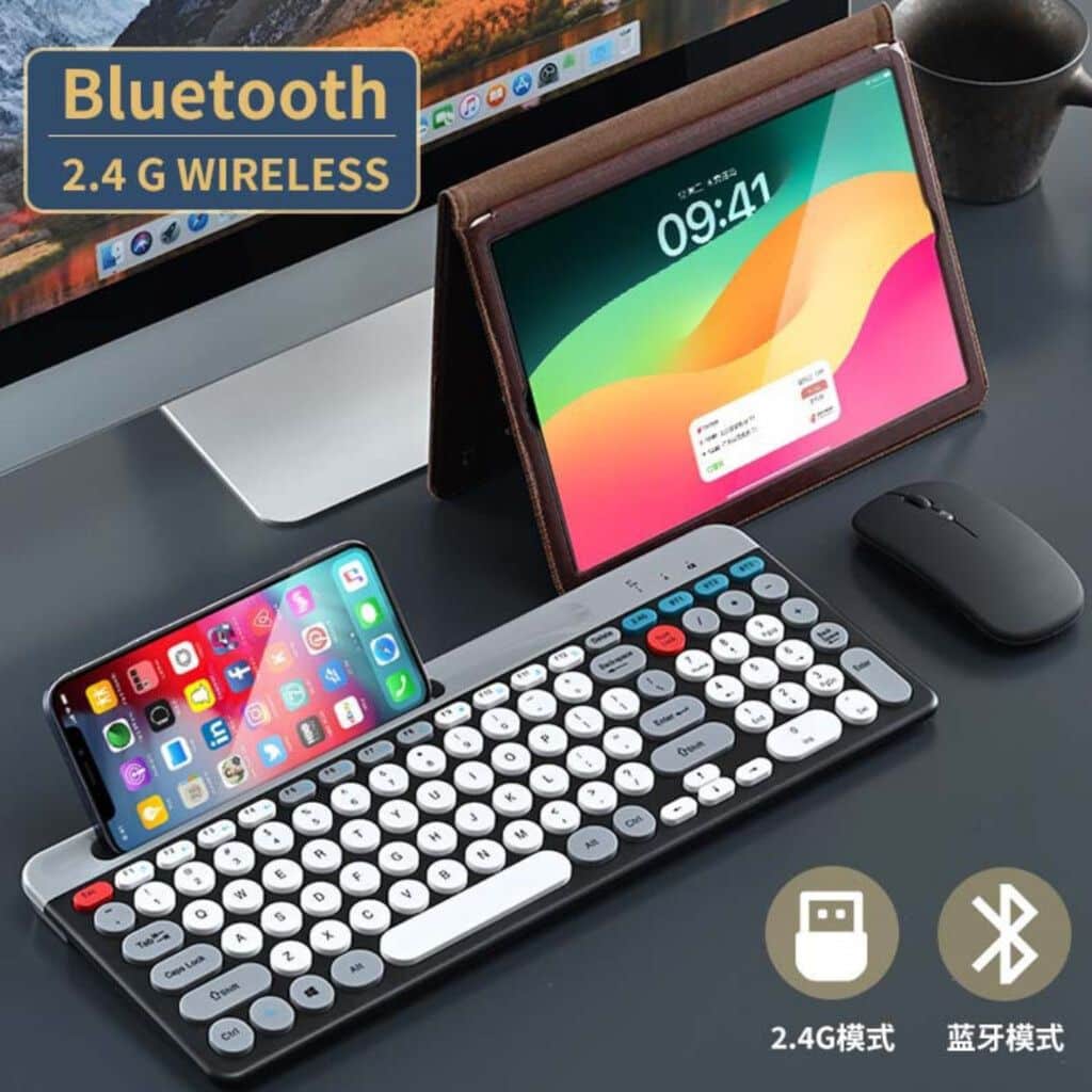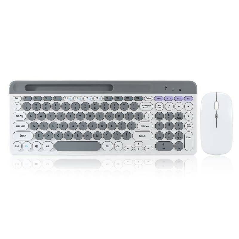 El teclado cuenta con 104 teclas redondas, diseño elegante y conectividad 4 en 1 (2.4G + 3 Bluetooth) con alcance de hasta 10 metros. Su batería incorporada de 400mAh se recarga fácilmente por puerto Tipo C e incluye guía para celular integrada.