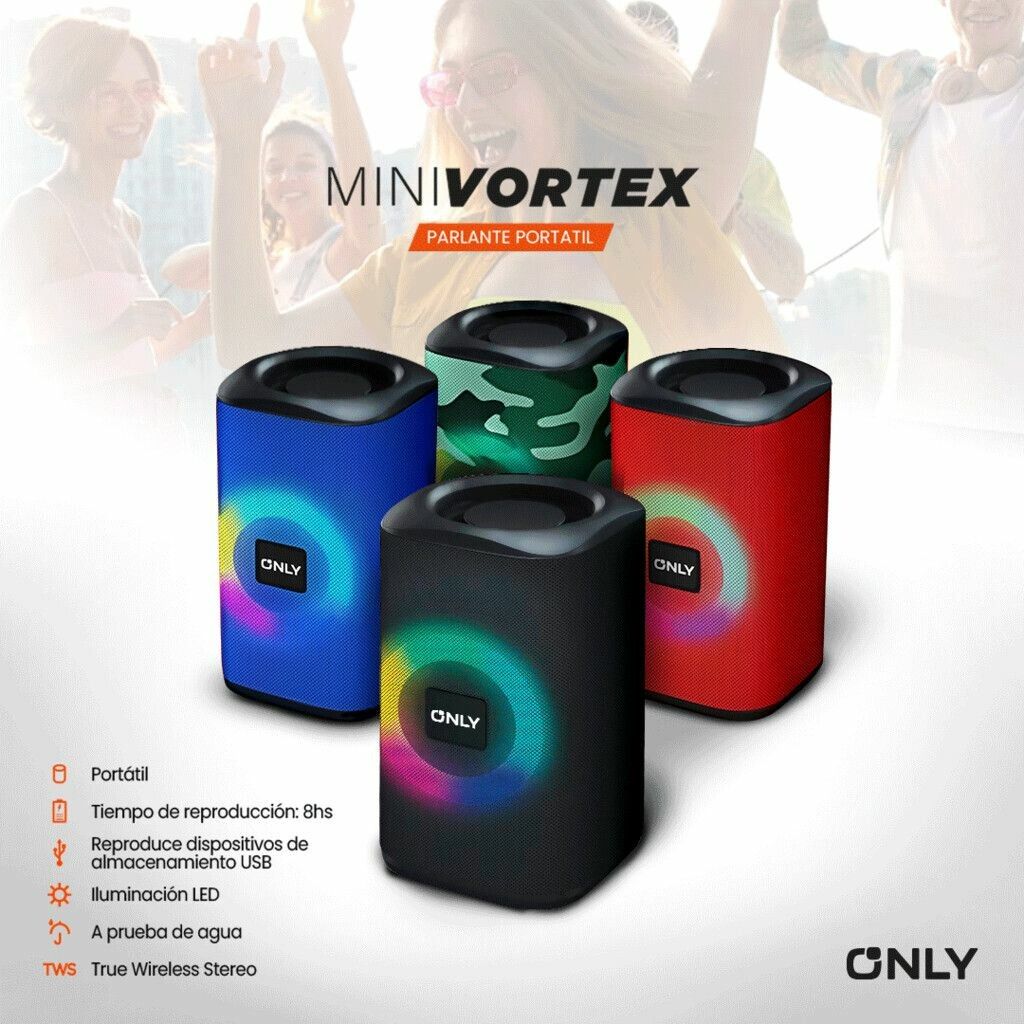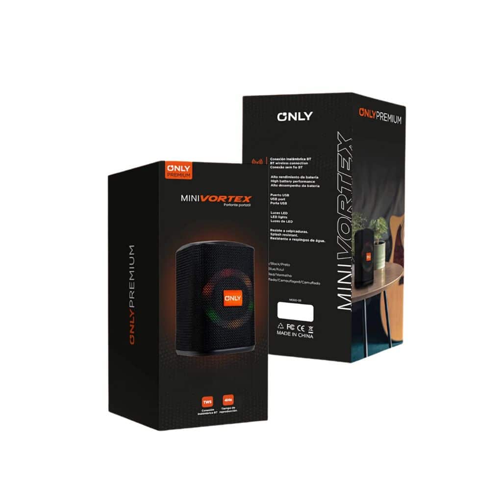 Cuenta con Bluetooth 5.0, entrada AUX 3.5mm, radio FM, ranura MicroSD y función TWS, permitiendo sincronizarlo con otro parlante para una experiencia estéreo. Su batería de 500mAh proporciona hasta 4 horas de reproducción y se recarga fácilmente mediante su entrada V8.