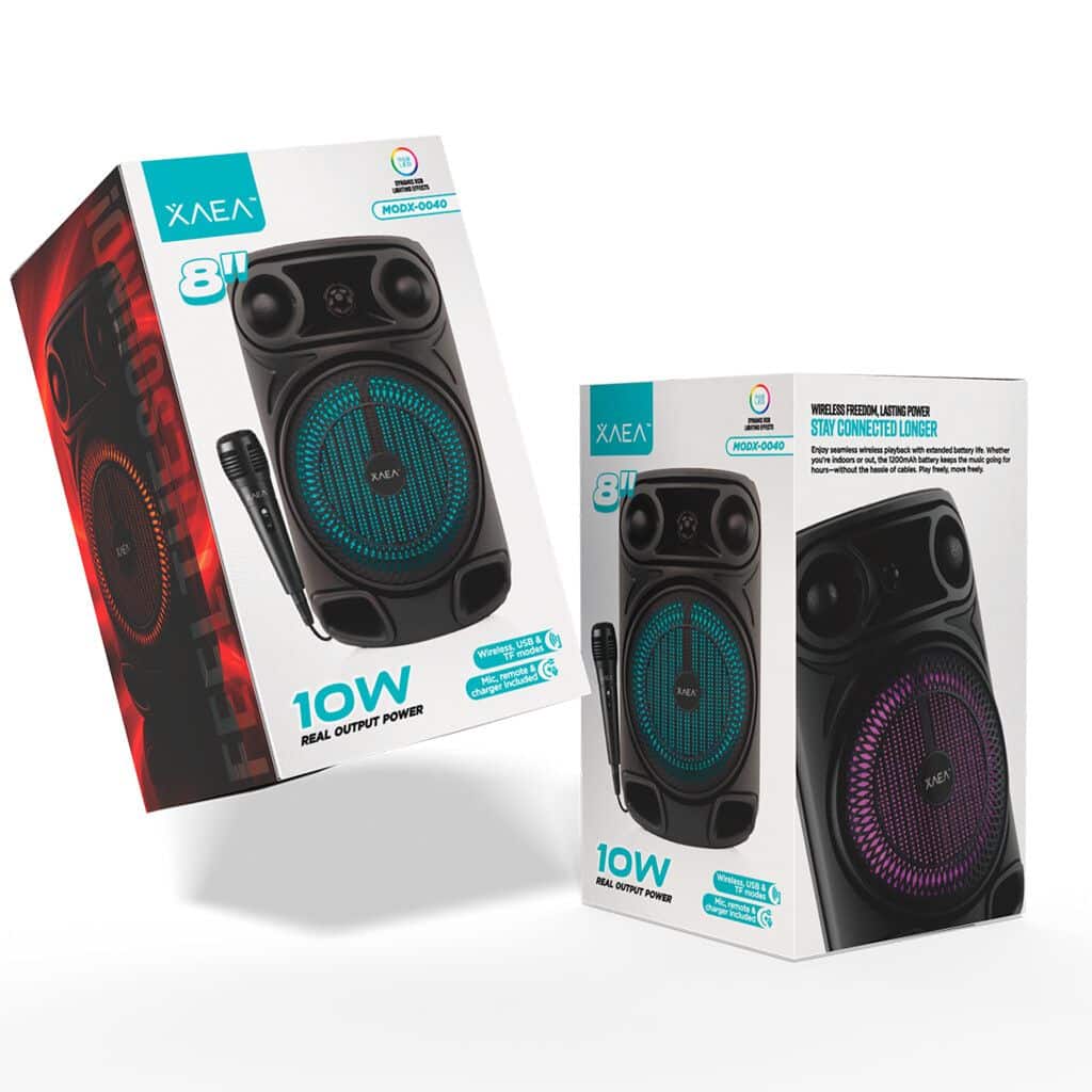 Este parlante de 8» con potencia de 10W es ideal para uso doméstico, reuniones pequeñas o karaoke en familia. Incluye micrófono con cable, control remoto y entradas TF, USB, AUX y MIC de 6,5 mm. Compacto y funcional, listo para acompañarte en cada ocasión.