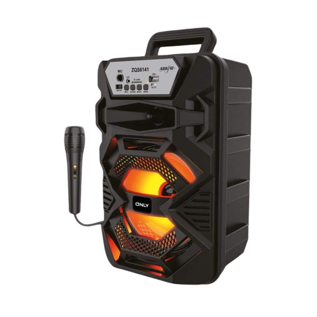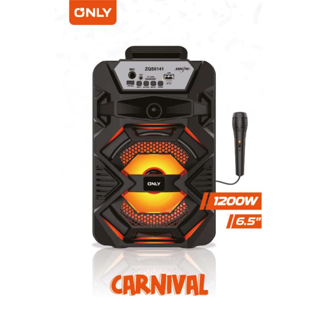 El parlante Carnivale de 6,5» ofrece 1200W de potencia en un diseño portátil, ideal para reuniones y celebraciones. Reproduce música desde USB, TF, FM, entrada auxiliar o micrófono, e incluye un micrófono con cable y cable de carga. Con batería de 1200mAh, llevá tu show a donde quieras.