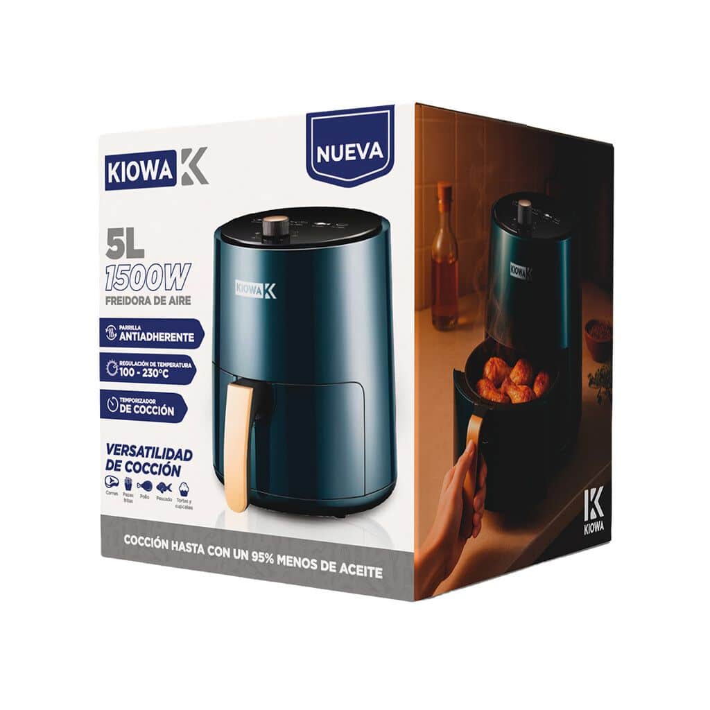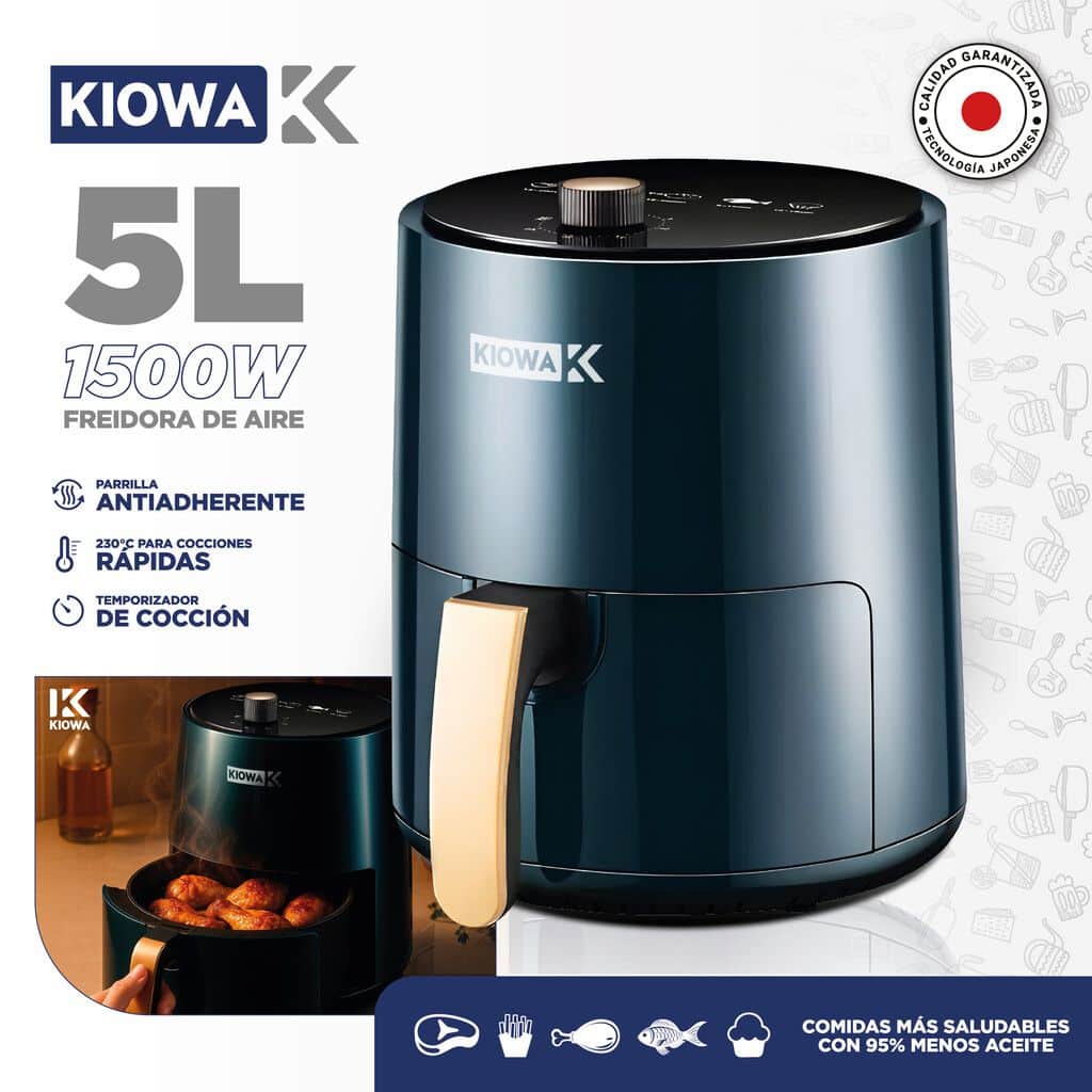 La Freidora de Aire KIOWA MODK-0059 es la solución ideal para quienes buscan una forma más saludable de disfrutar sus comidas favoritas. Con una capacidad de 5 litros y una potencia de 1500 W, permite cocinar una variedad de platillos utilizando aire caliente, logrando resultados crujientes sin necesidad de aceite. Su diseño práctico incluye un temporizador que facilita el control del tiempo de cocción, asegurando que cada preparación sea perfecta. Además, cuenta con una superficie antiadherente y una parrilla que optimiza la experiencia culinaria, permitiendo una limpieza sencilla y rápida. La KIOWA MODK-0059 es perfecta para familias o reuniones, ya que su capacidad permite preparar porciones generosas. Su diseño compacto y funcional se adapta a cualquier cocina, convirtiéndola en un electrodoméstico esencial para quienes desean disfrutar de comidas deliciosas y saludables. Caracteristicas: -Cocina sin aceite: Disfruta de comidas mas saludables, hasta un 95% menos de grasa. -Potencia: 1500W, Calentamiento rapido para una cocción eficiente y uniforme. -Capacidad: 5 litros, ideal para preparaciones de 2 a 4 personas. -Temporizador: 30 minutos, apagado automatico para mayore precisión y seguridad. -Parrilla Antiadherente: facilita la limpieza, y evita que los alimentos se peguen. -Mango de toque frio: Diseñado para evitar quemaduras al manipular la cesta. -Versatilidad en la cocina: Frie, hornea, tuesta y asa. Todo en un solo electrodomestico