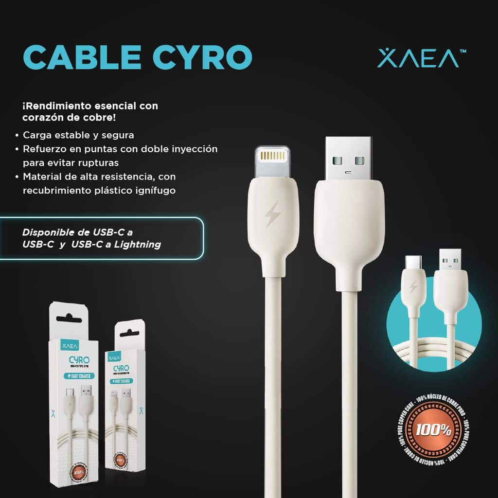 El cable CYRO está diseñado para brindar un rendimiento confiable y duradero gracias a su construcción con hilos 100% de cobre. Esta elección de material garantiza una carga más estable, mejor conductividad y menor generación de calor, factores clave que marcan la diferencia frente a cables de menor calidad.