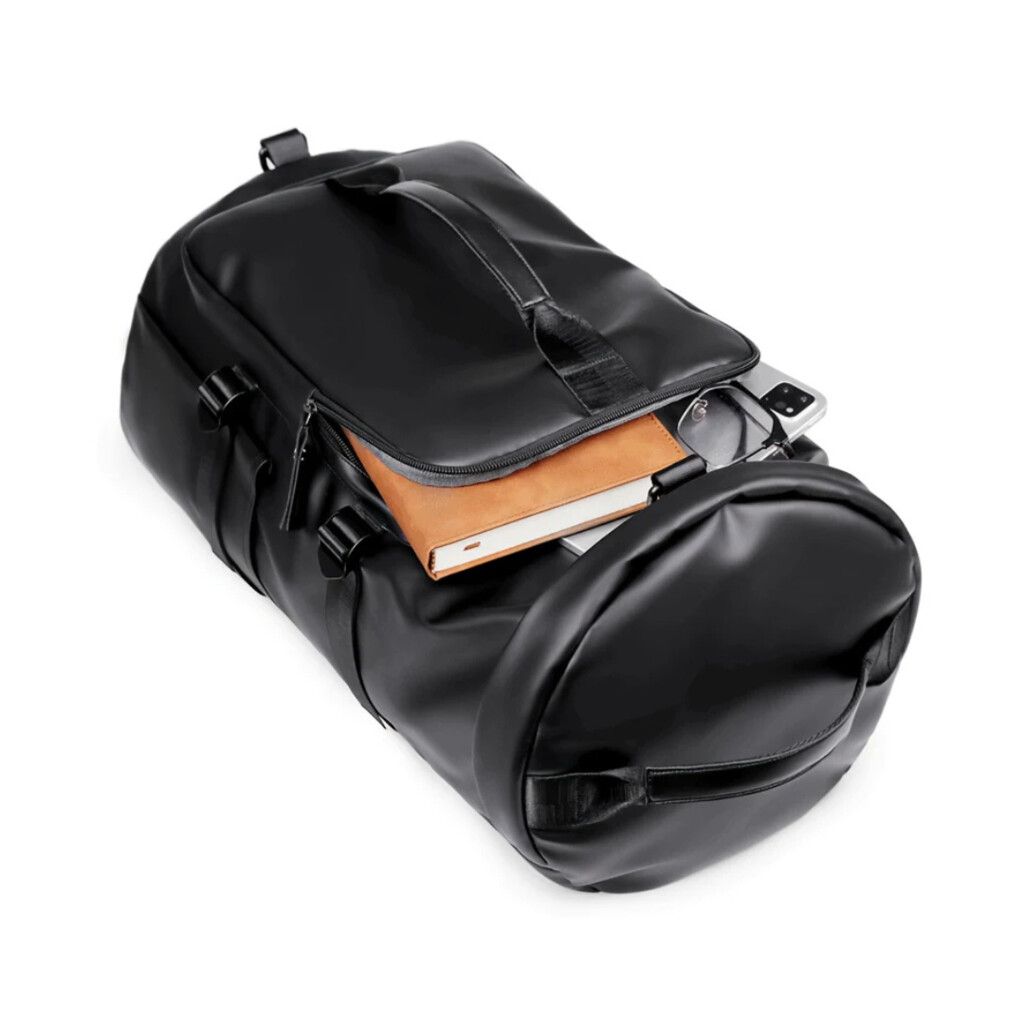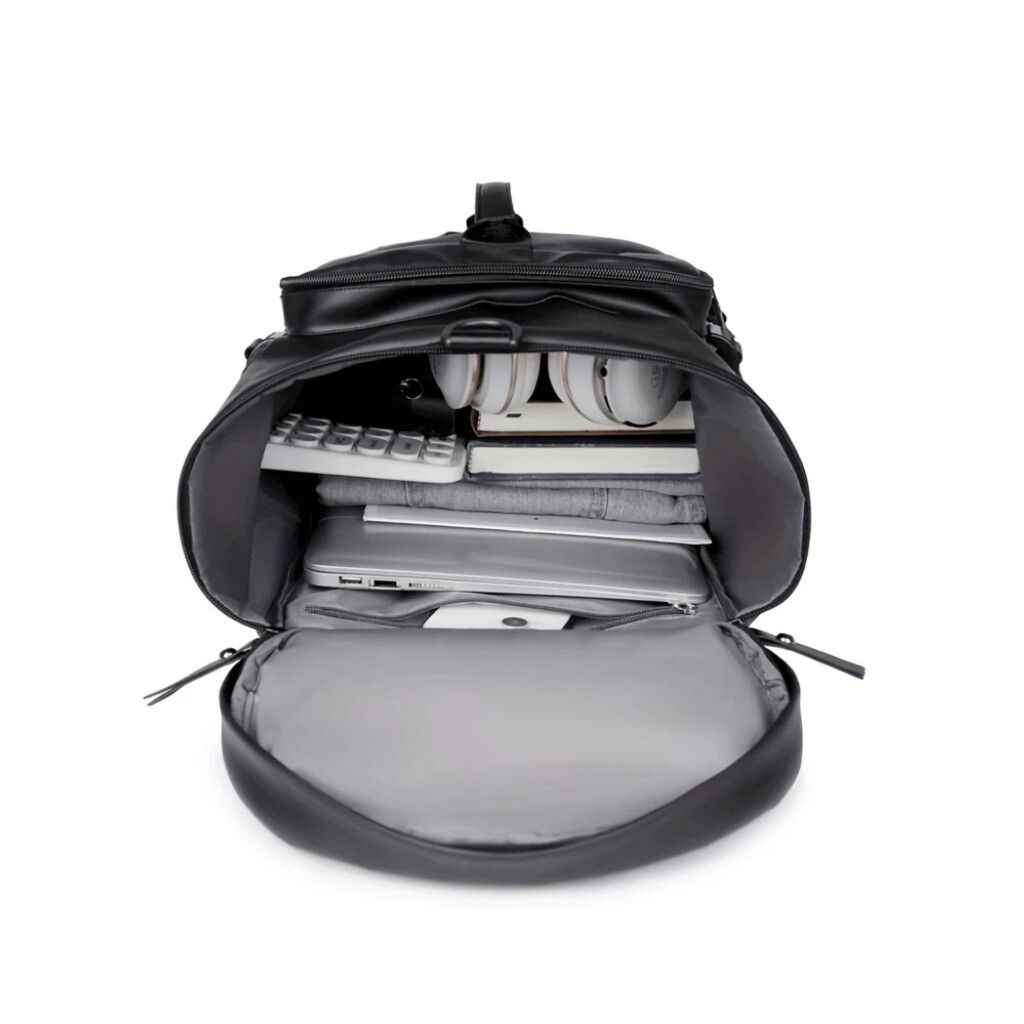 Medidas: 46 cm. ancho, 26 cm. alto, 24 cm. profundidad Color: negro Material: PU, impermeable Funciones: bolso y mochila
