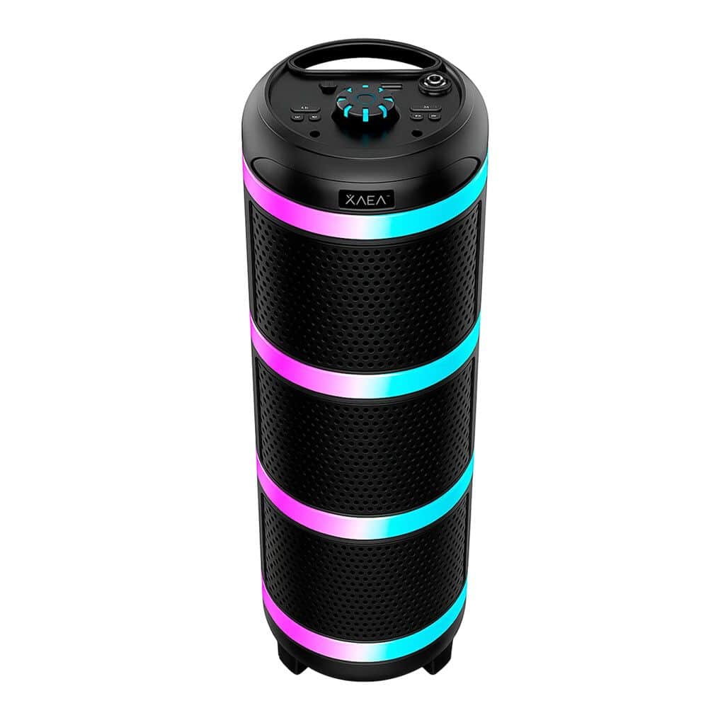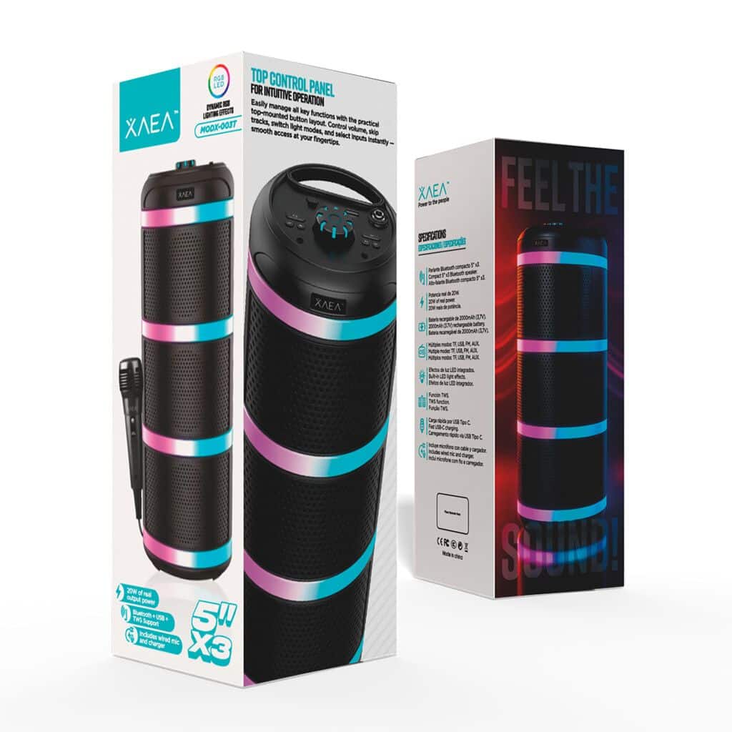 Un parlante compacto pero potente, con 20W de salida para disfrutar música en cualquier espacio. Su batería de 2000 mAh ofrece horas de uso continuo y se recarga fácilmente mediante puerto Tipo C. Con funciones TF, USB, FM, AUX, TWS y luces LED RGB, este modelo es perfecto para ambientar y animar reuniones.