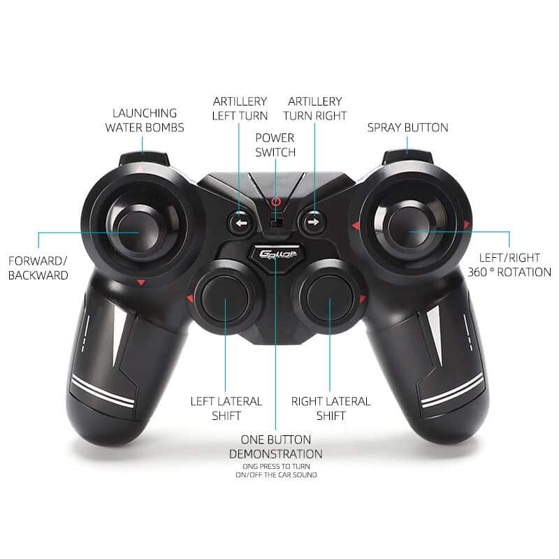 Auto Acrobata Todo Terreno (Asfalto-Arena) tipo 1203A, a control remoto, traccion delantera y trasera, giro 360º, Sistema de escape en spray con iluminacion, Luces y sonido, Bateria de litio con proteccion 14500, 500 mAh, 3,7v, tiempo de carga: 60 min, tiempo de uso: 45 min aprox, Timpo de pulverizador: 15 min. aprox. distancia del mando hasta 50 metros, colores disponibles,: Azul