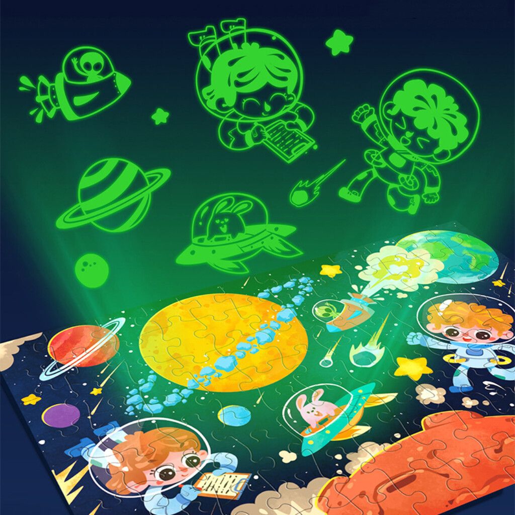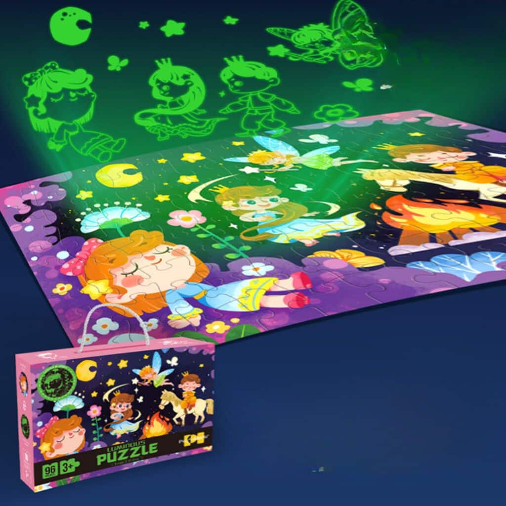 Juego de rompecabezas luminoso, 96 piezas, dirigido a niños de 4-6 años, presentacion en caja llamativa con asa. Disponible en 5 versiones: Espacio, Hadas, Animalitos, Aventura Marina y Dinosaurios. Se pueden combinar 3 variedades en un KIT / 28 por cada uno